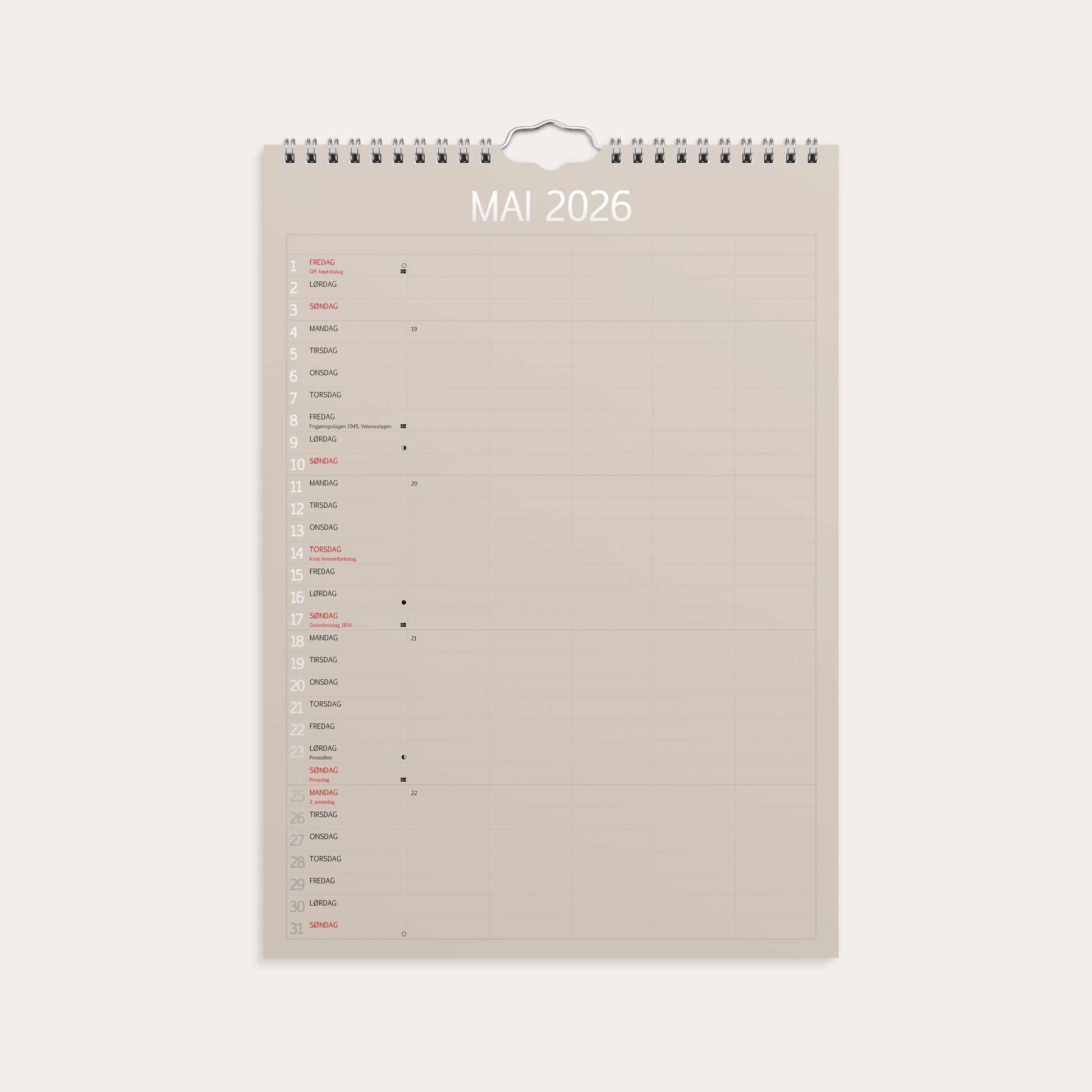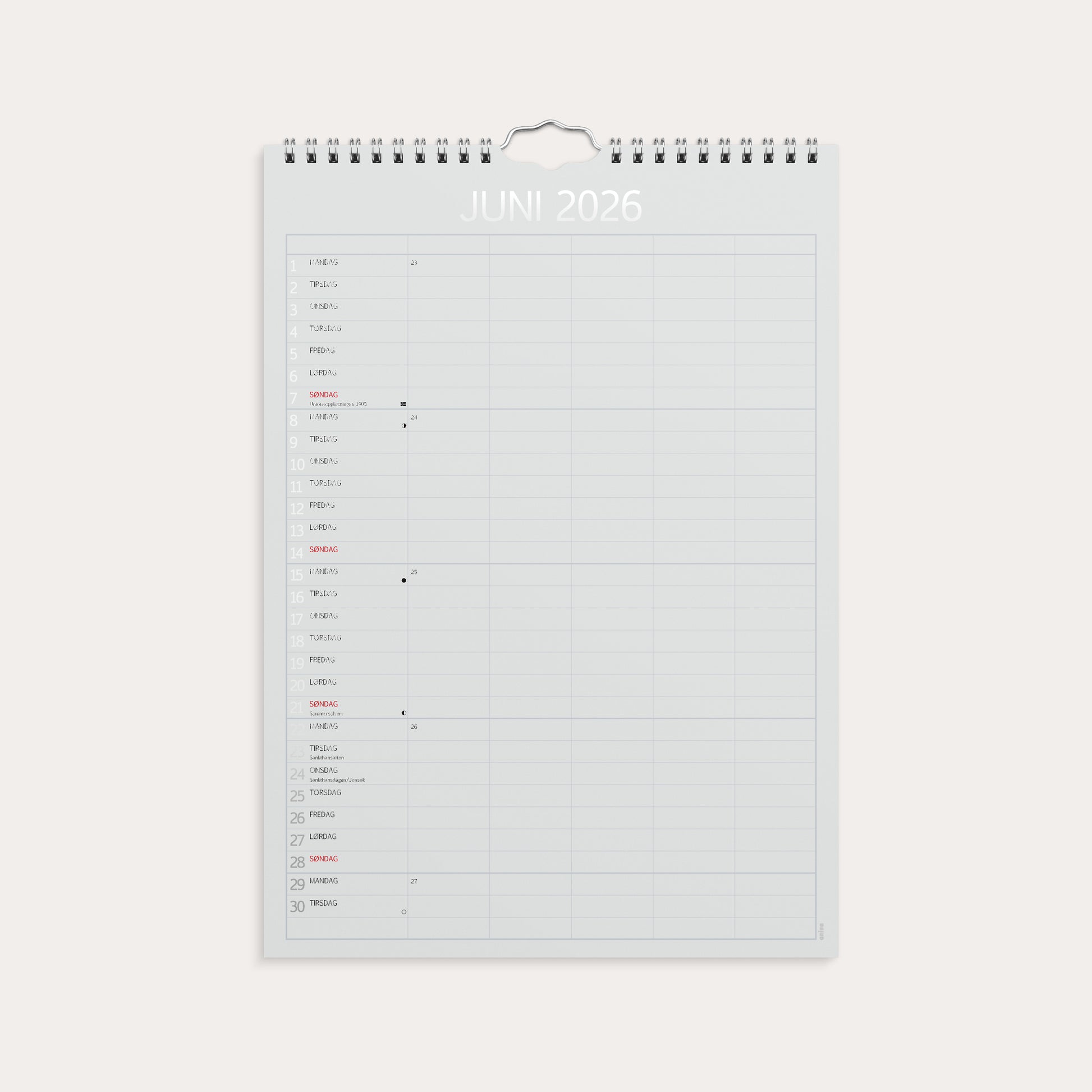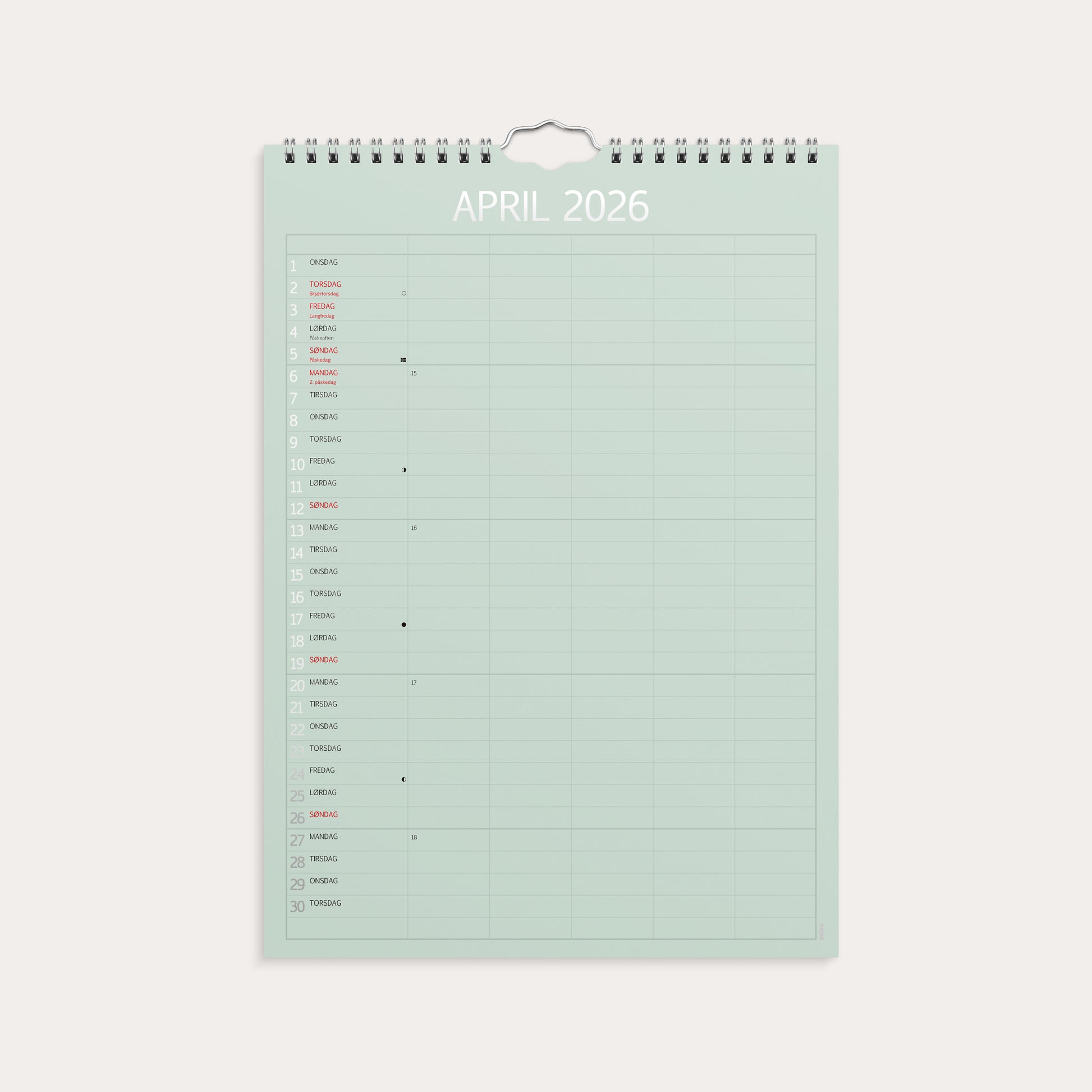 Familiekalender i praktisk og elegant design med ulike farger. Kalenderen er delt inn med en måned per side. Hver måned er delt inn i 5 kolonner, slik at hvert familiemedlem har sin egen kolonne hver dag. På den måten kan du raskt og enkelt få en oversikt over hele familiens aktiviteter og avtaler.