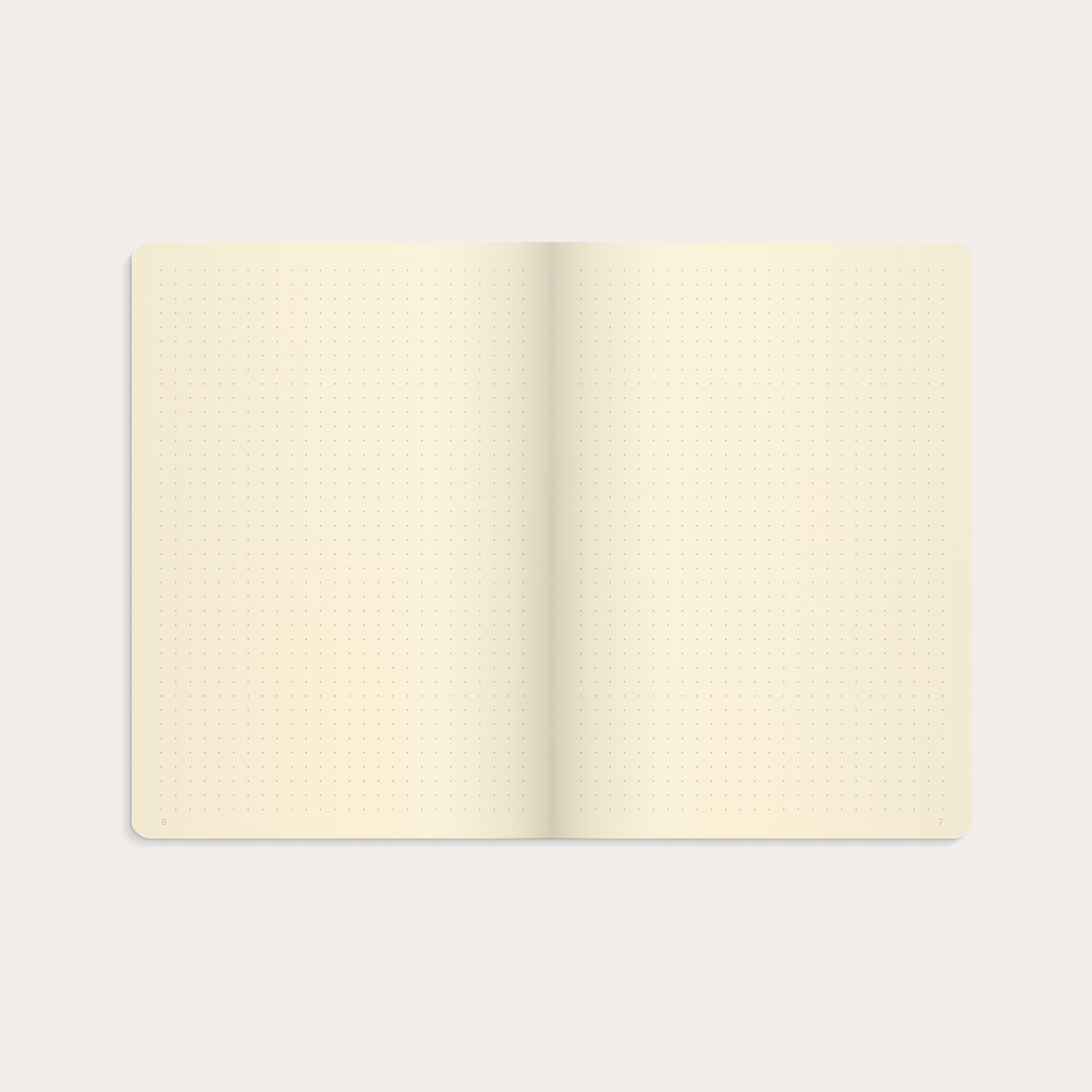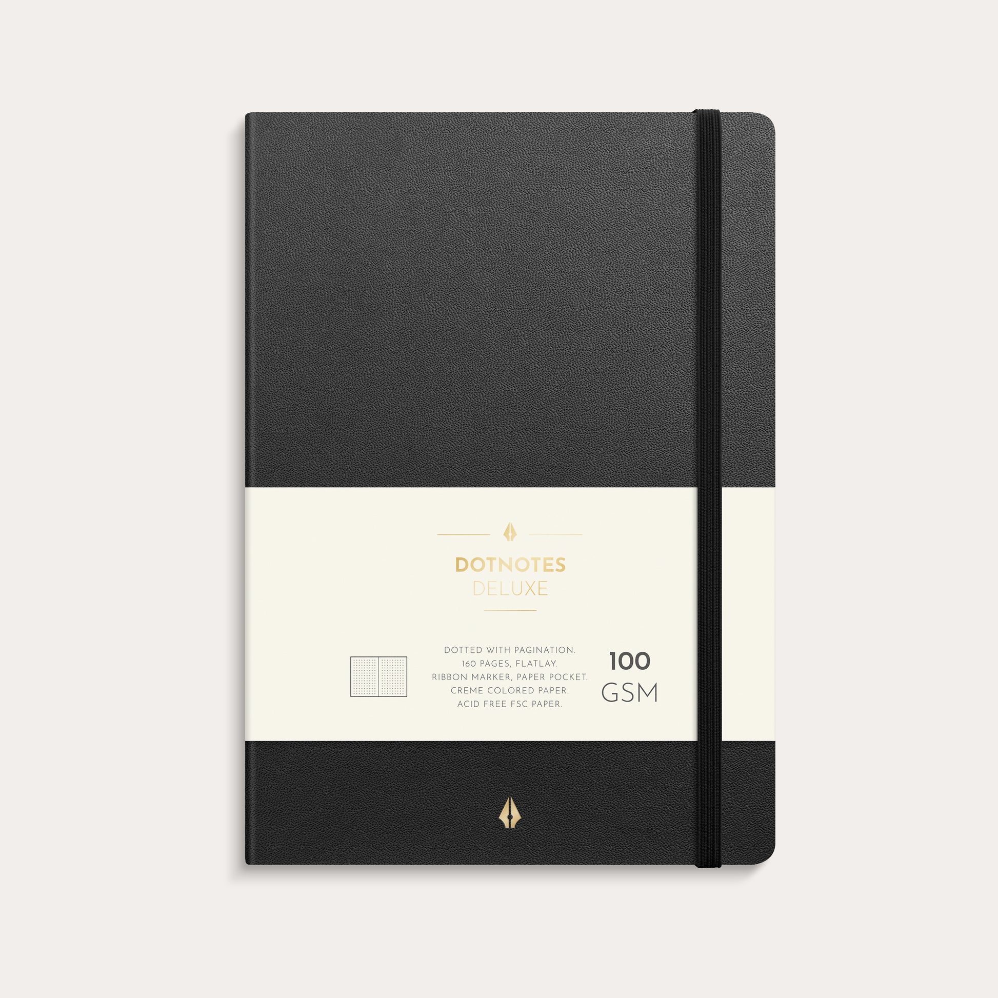 An exclusive DotNotes in A5 with a soft faux leather cover in classic black. It lays flat when writing and is perfect for Bullet Journaling, ideas, lists, or as a creative journal. Create your own structure with the “Content” pages as an index. DotNotes contains 160 dotted cream-colored pages and practical details such as an elastic band, a bookmark, and an inner pocket.