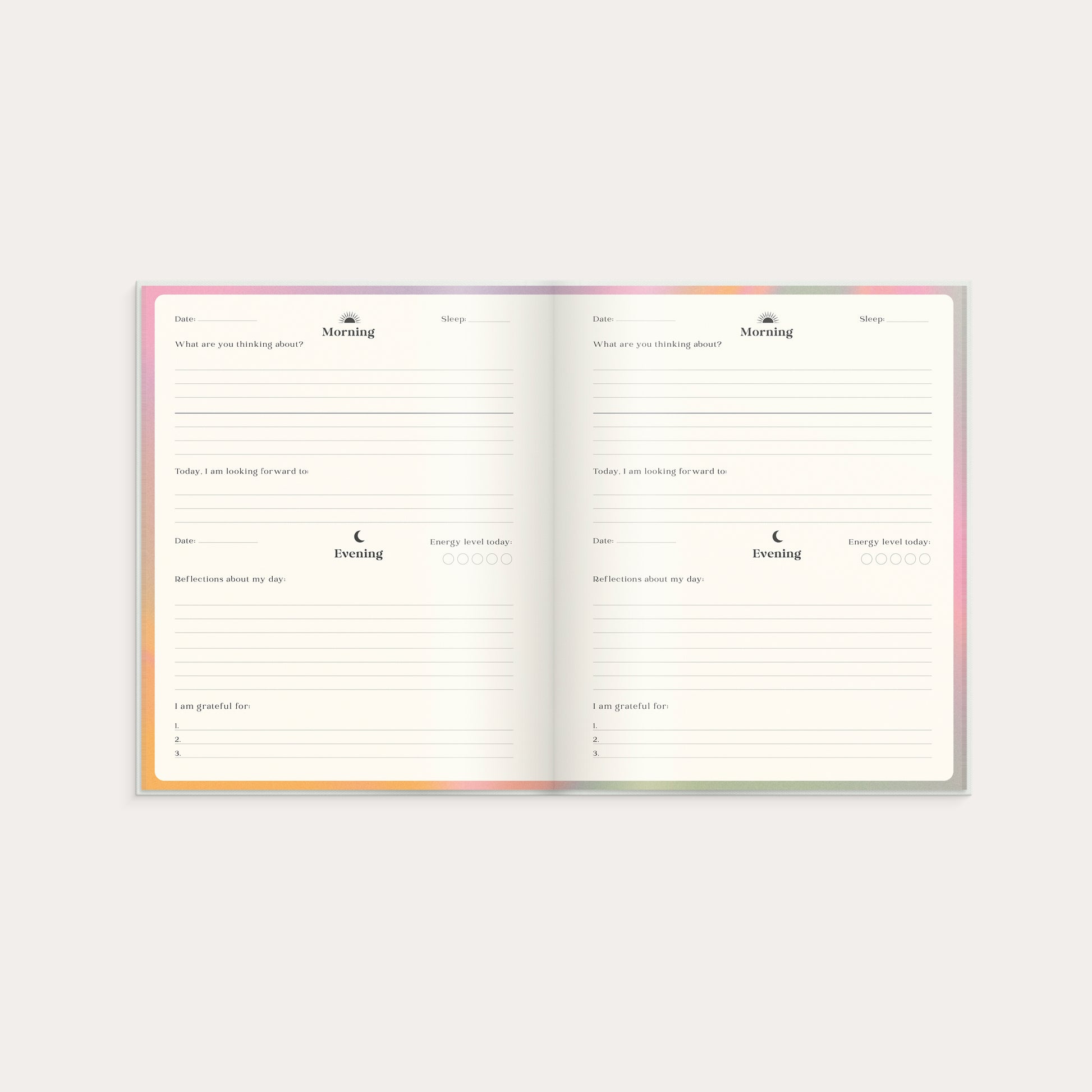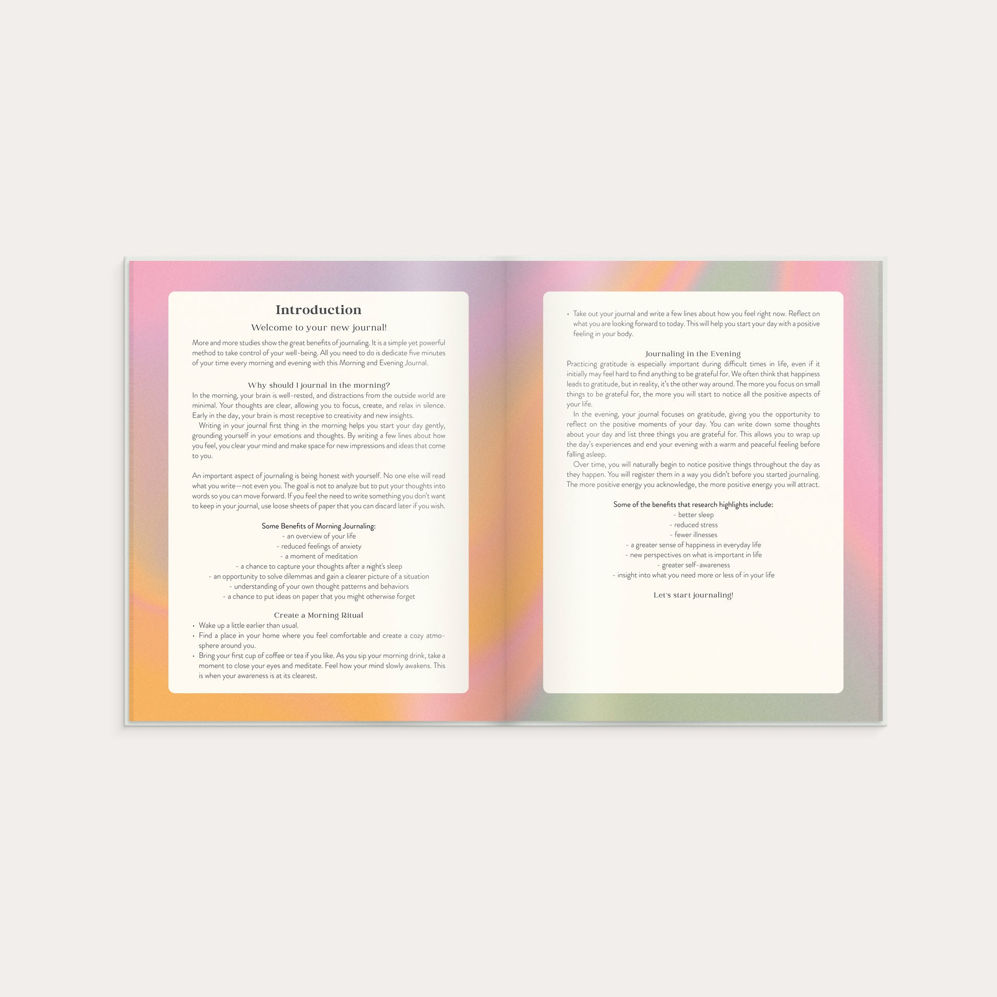 In the morning, the journal helps you start the day gently. By writing a few lines about your thoughts and feelings, you clear your mind and open up to new ideas and insights.